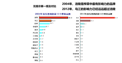 首先,我们来看“中国榨菜数涪陵,涪陵榨菜数乌江”的诉求是否能够支持乌江品牌的持续发展,通过2012年与2004年的几组数据的对比,我们找到了有意思的信息对比